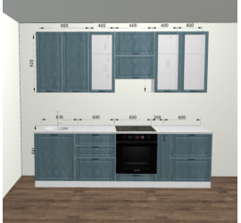 Размер кухонного гарнитура: Ширина левой стороны 3000 мм. Ширина правой стороны 1700 мм. Высота 2336 мм. Глубина 600 мм. (с учетом столешницы)